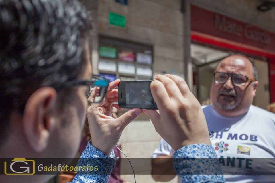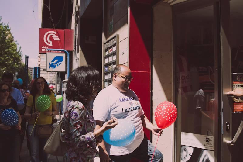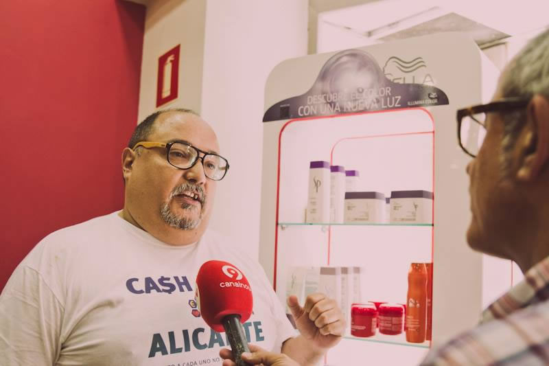 En éste momento aparece el periódico La verdad y nos hace una entrevista acerca del próximo cashmob. Hasta ese momento no habíamos compartido información con medios tradicionales. Fue a partir de ese momento que compartimos esa noticia publicada cuando la cosa explotó, empezaron a enterarse muchas personas y más medios, ya la cosa funcionaba, nos entrevistaron en Alacantí TV, luego el Periódico Información de Alicante y a partir de ahí todo fue una locura… Una locura genial. Nos empezaron a contactar comercios de la ciudad y personas físicas, ofreciendo su ayuda y colaboración desinteresada, sus ganas de ayudar, entrevistas en la radio, en periódicos para extranjeros en España, pudimos hablar con representantes de otros partidos políticos interesados por la acción y que nos visitaron el día del evento…