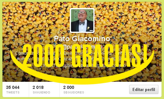 Y así llegamos al día de hoy, con mas de 2000 seguidores en Twitter, Facebook creciendo día a día, la Fan Page de Imaginaxión Comunicación Visual 2.0, con más de 450 fans, un grupo privado en Facebook de Comunicación Visual, creado por mi, súper divertido y dinámico (estáis todos invitados a unirse), LinkedIn, Tumblr, Foursquare, Pinterest, Bindme y otros blogs como: “Qué Tiempo Tan Très Chic” y “Las Infoarqueologías de Pato” creciendo día a día en seguidores, movimiento e interacciones. ( http://about.me/patogiacomino )